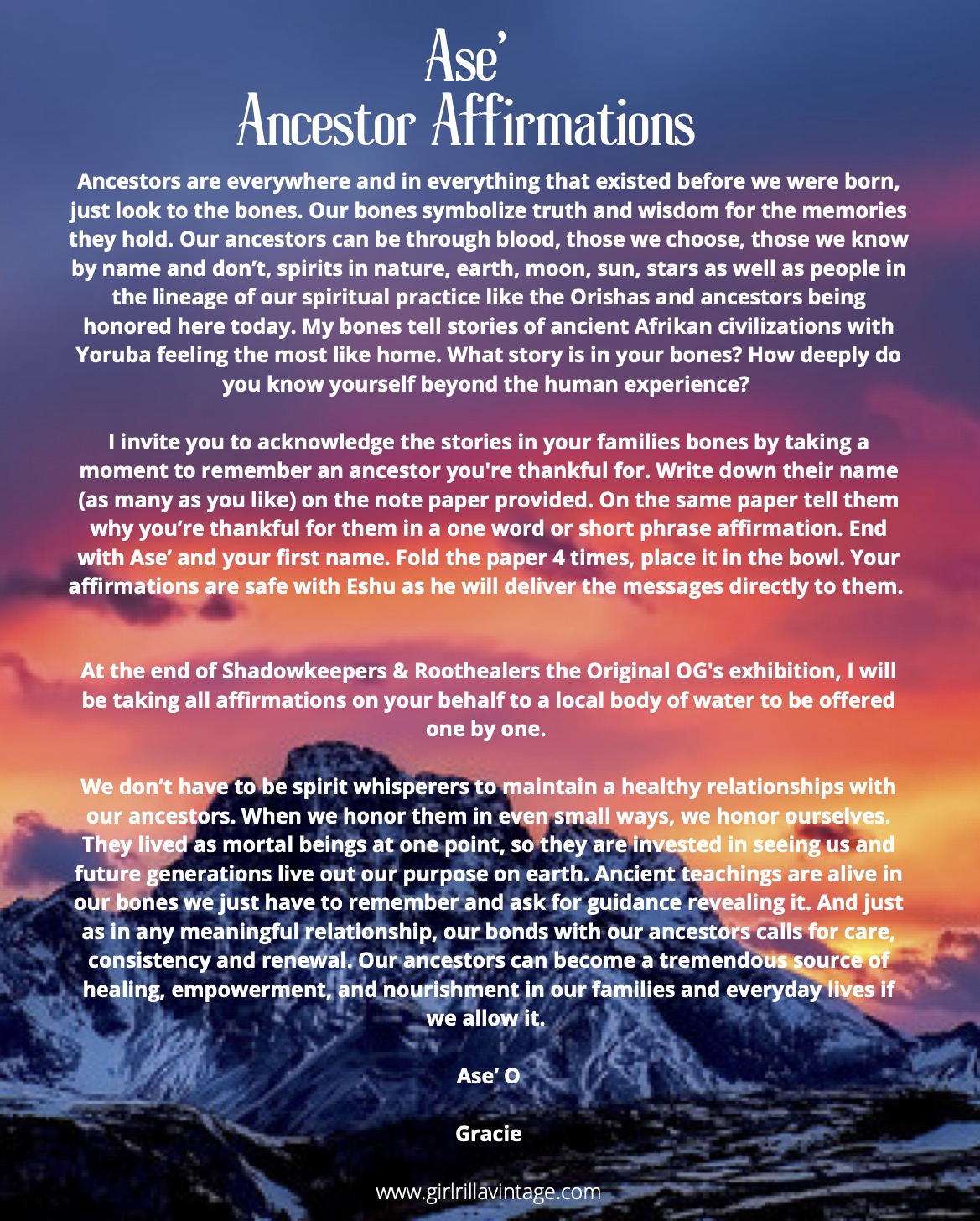 Ase’ Ancestral Affirmation Instructions that were on display at the Shadowkeepers & Roothealers Exhibit at The Ware Center-Millersville back in June 2022.