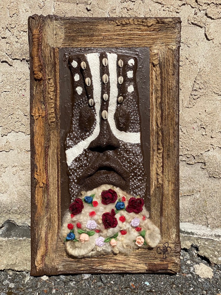 About the piece: I named the piece, Ancestor Tones because I want to pay homage to melanin. All shades of Black skin are vibrant, biological reflections of nature and the universe. In fact, the very cosmology of enslaved Afrikan people and their descendants is a form of universal wealth. It’s an unspoken truth and inherent birth right, no matter how one was born into it. Ancestor Tones explores themes of Afro-futurism connecting past, present and future. I think of Frederick Douglass as an Afro-futurist because he paved the way as a community educator and revolutionary for the Black people of his time. Not to mention he was the most photographed human-being of the era. He embodied what reimagining a Black future looked like by the way he controlled the narrative of his Afro-diasporic experience of the day. And continues to inspire generations in modern times. Take Amanda Gorman for instance, the youngest Black inaugural poet in American history. She credits Frederick Douglass with teaching her how to use technology for social justice. She reminds us of how intentional he was about capturing a counter-image to the Black American stereotypes at the time and how important that message is in her own work. You’ll notice hints of red and gold, a symbol for Amanda Gorman on Inauguration Day. The glow of her young, gifted and Black spirit, shining so much bigger than her body. Center to deep, Black, shadowy cowrie shells, wool and cotton, symbols of the million and one ancestral spirits surrounding her, journeying with her as she reclaims her humanity.