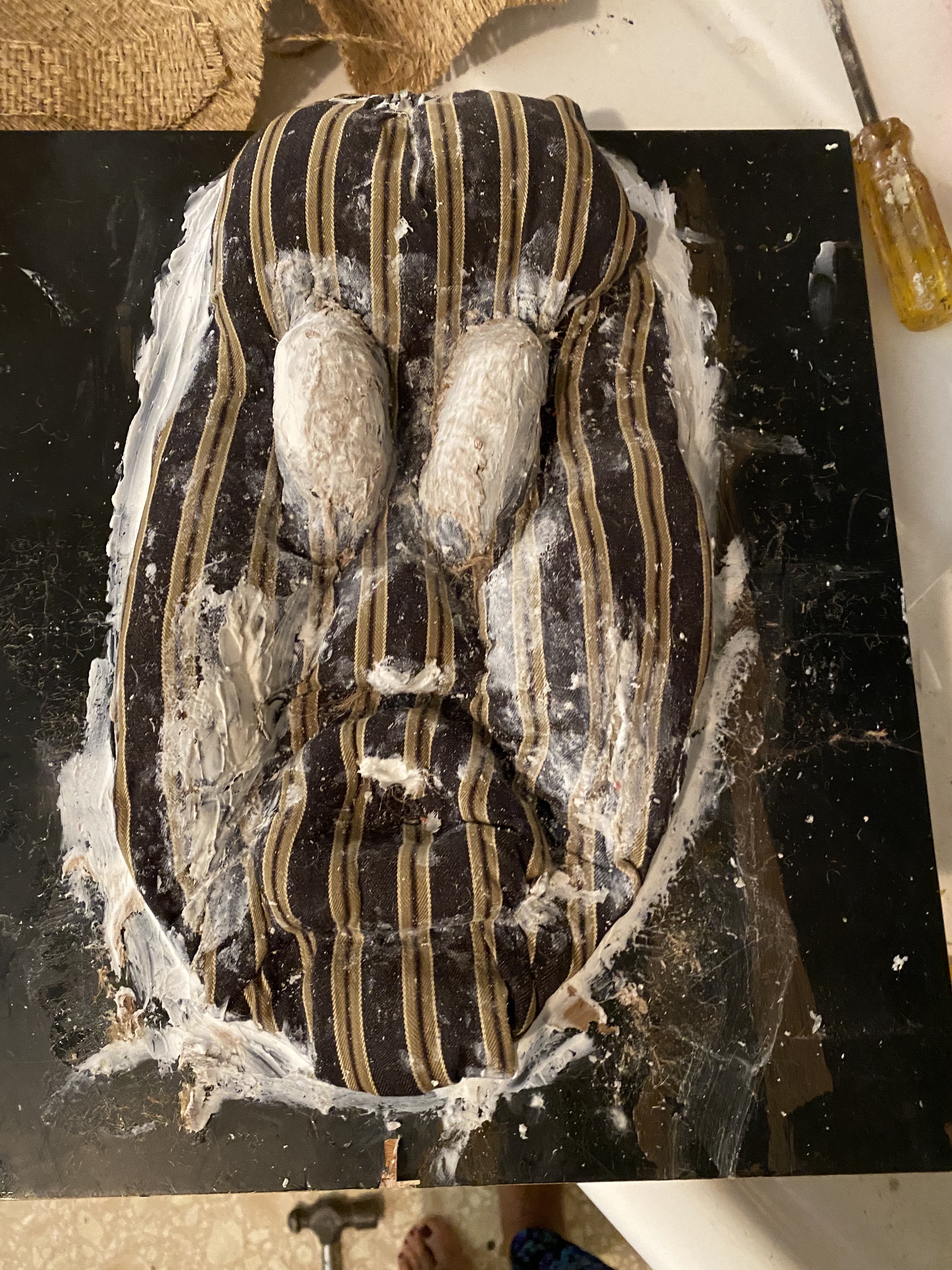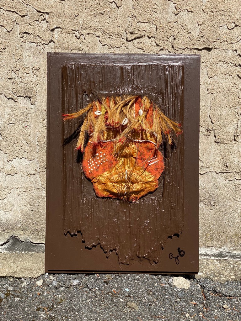 I call him Mr. Jute, the 2nd mask I made in the Antebellum South Afrikanface Mask Collection for the codes in his fabric are durable, tough and textured. His eyes are spiritual and possess life times, stoic, peaceful, calm. The epitome of resilience, stillness. It’s the second mask I made in the Antebellum Tribal Afrikanface Collection. Check out my process in the images below. Now on view @pavaagallery.