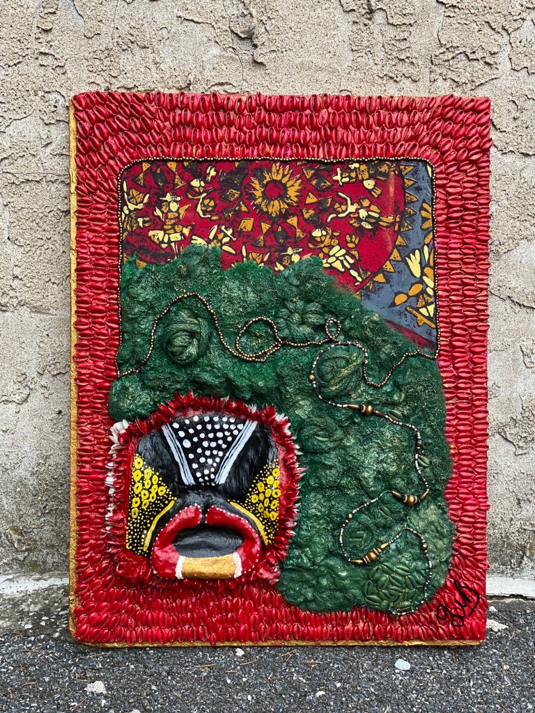 I don’t know what to call this one, but I know it has something to do with cowrie consciousness and the Orisha Ogun. This mask is the 6th mask I made in the Antebellum Tribal Afrikanface Collection.