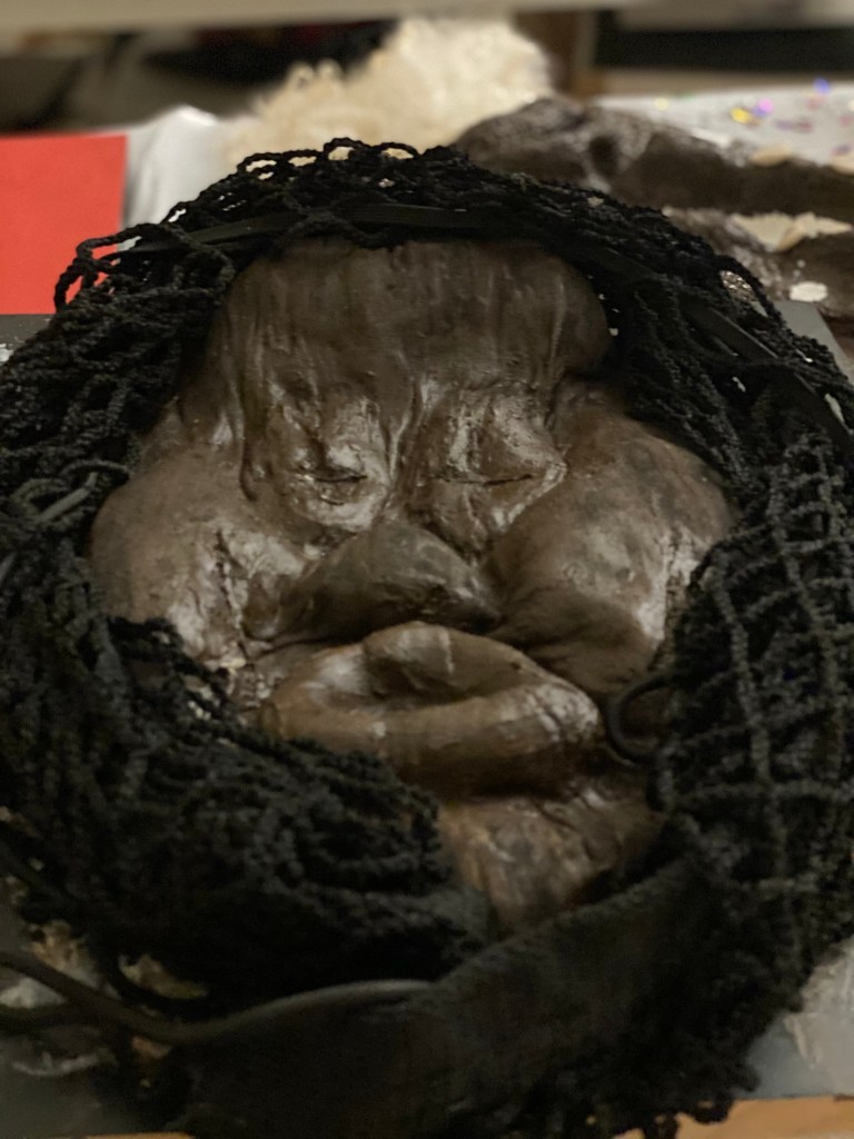 I call her AfroDalit, for the story in her fabric was sourced from India. The 4th mask I made in the Antebellum Tribal Afrikanface Collection. I created this piece, one to show that Afrikans live all over the world and two to correlate shared experiences of the oppressive caste systems of Afrikans born in the American South to those born in India like (the Siddi” descendants of the Bantu people and the “Afro Dalit” better known as the “untouchables” of India who are darker skinned Indonesians).